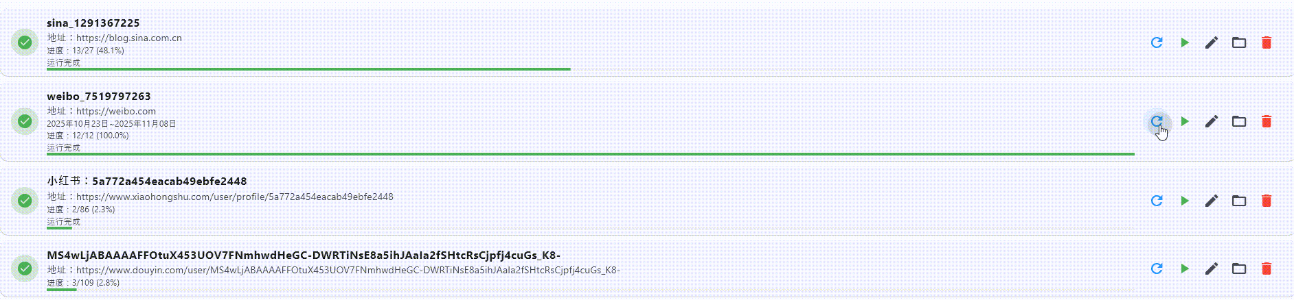 之前获取微博数据时没有进度显示,用户体验不够友好。 现在,WebCloner增加了任务详细进度显示,让你对备份进度一目了然!